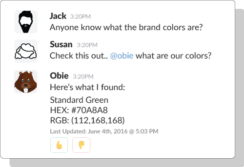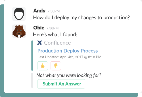 Simply ask Obie a question, and he'll instantly provide you with the answer. With Obie, all of your team members have access to an expert. Save time by avoiding repetitive questions, shoulder taps, and calls that halt your focus.